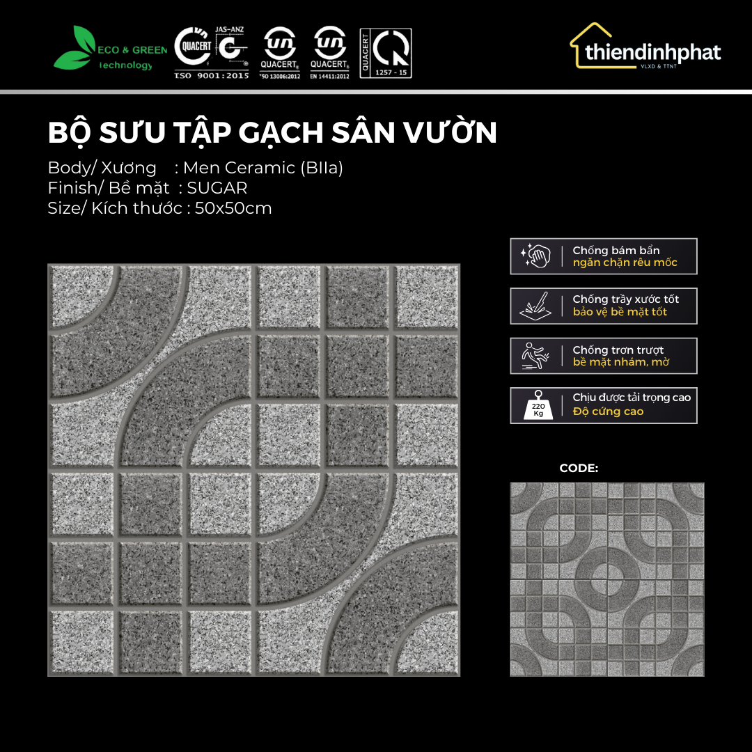 - Bề mặt: MỜ, chống trơn trượt, dễ vệ sinh, chịu tải trọng cao, chống rêu mốc, chông thấm <10%